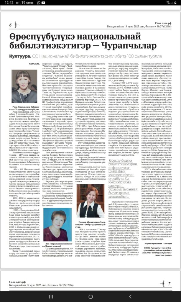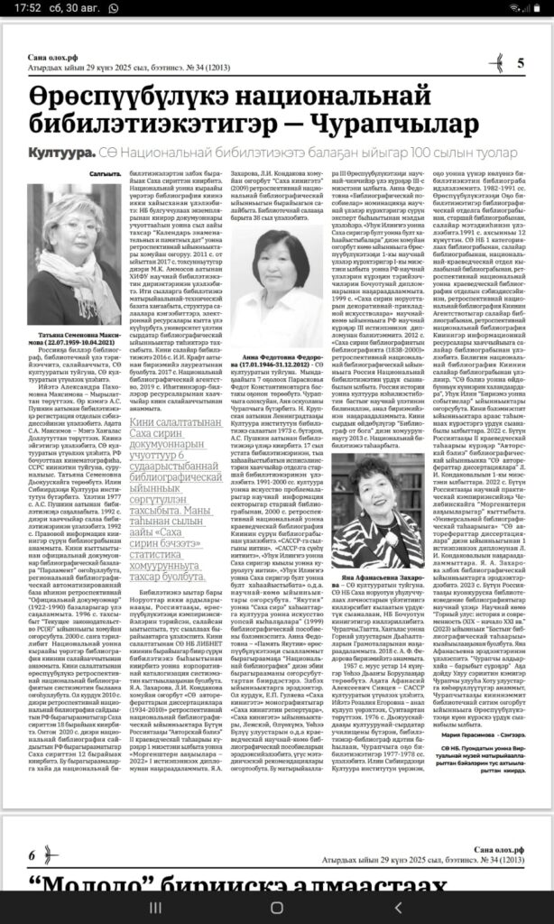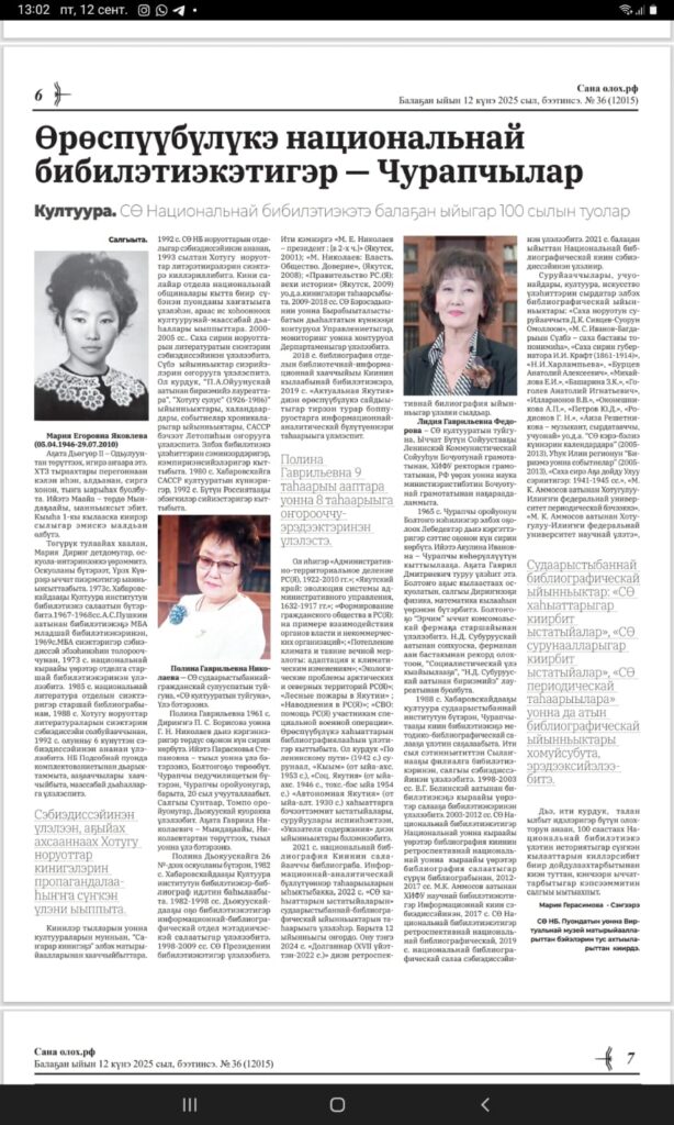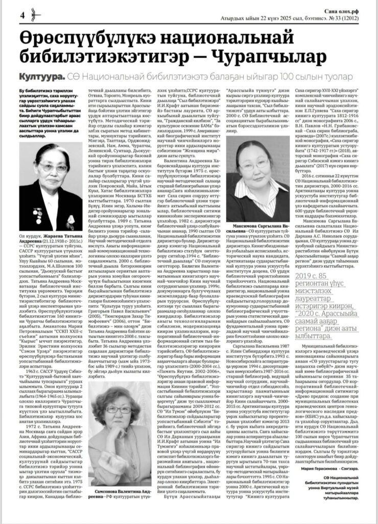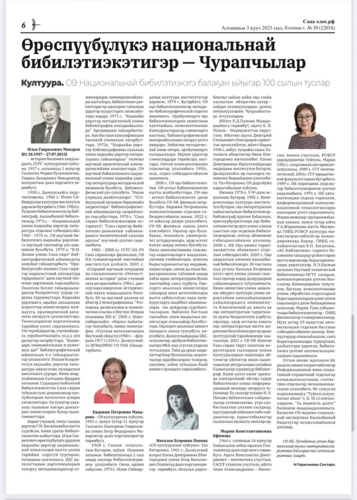 Историяны кэрэһэлээн… ССРС култууратын туйгуна, РСФСР култууратын үтүөлээх үлэһитэ, РФ Суруналыыстарын союһун чилиэнэ, култуура бэтэрээнэ Мария Андреевна Герасимова — Сэҥээрэ СӨ национальнай бибилэтиэкэтэ тэриллибитэ 100 сылыгар анаан Чурапчы улууһуттан төрүттээх СӨ Национальнай бибилэтиэкэтигэр таһаарыылаахтык үлэлээбит уонна билигин да үлэлии, айа-тута сылдьар үлэһиттэр тустарынан саҥа ыстатыйата «Саҥа олох» хаһыат 39-с нүөмэригэр таҕыста. Биир дойдулаахтарбыт история билимин хандьыдаата , ССРС култууратын туйгуна Макаров И. Г., СӨ култууратын туйгуна Макарова Е. П., СӨ култууратын туйгуна Попова Н. Е., Ефимова М. К. тустарынан ааҕыҥ!